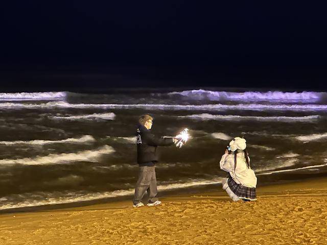 “在市中心跨年,听到的是人群的欢呼。在这里,你听到的是海浪一遍遍冲刷岸边的声音,像时间的脚步声。”来自广西的青年陈千熙裹着厚厚的围巾,他目光看向大海,身边的朋友为他拍下了站在火炬八街凝望大海的照片。“我要把这一刻记录在心里。今晚我们要赶赴荣成,去拍摄布鲁维斯沉船。”陈千熙说。