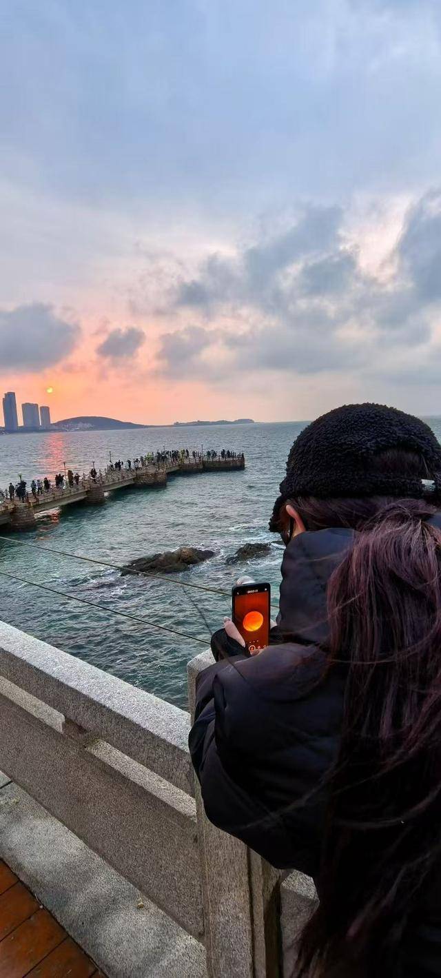 不远处的金海湾栈桥上,微微和两位好朋友一起在拍摄2025年最后一抹落日,在单反镜头里,金黄色的落日徐徐落下,这一幕绝美的景色让三人惊呼起来。微微不是本地人,而是从上海专门乘飞机来的“威海跨年小分队”。“这是我们第八年来威海跨年了,每年这个时候我都要到威海住上一个月,我走遍了全国很多地方,国外也去了不少景点,但是像威海这样冬天有雪、有山、有海的城市很少,威海很能‘出片’!”微微说,“第一次是偶然,第二次是怀念,再后来就成了一种习惯。从自己一个人变成和好朋友们一起,每年都会有不同的朋友主动跟她到威海来跨年。”威海跨年这种独特的美感,让人无比怀念。似乎海水可以洗涮旧年的一切疲惫,迎接新年的好运。